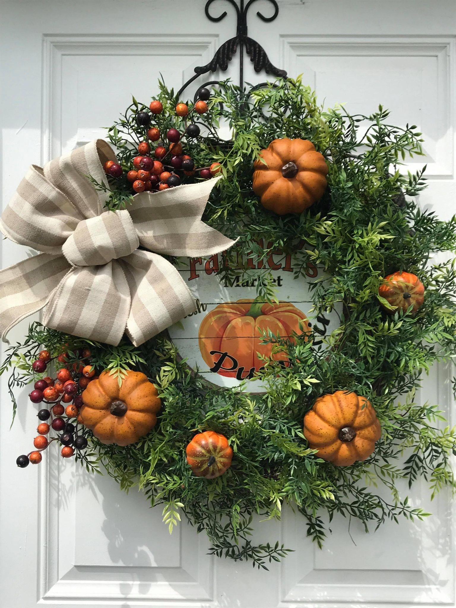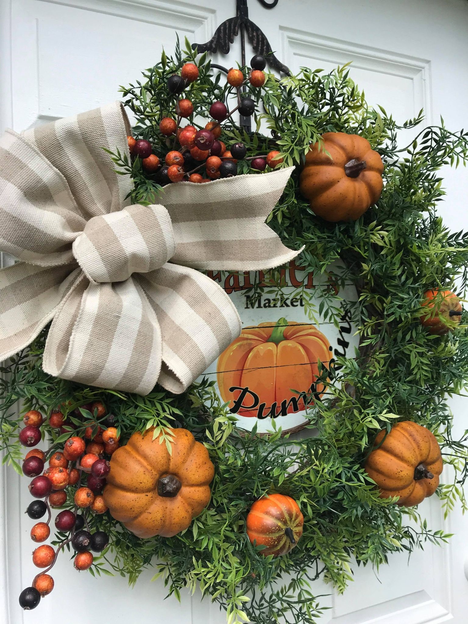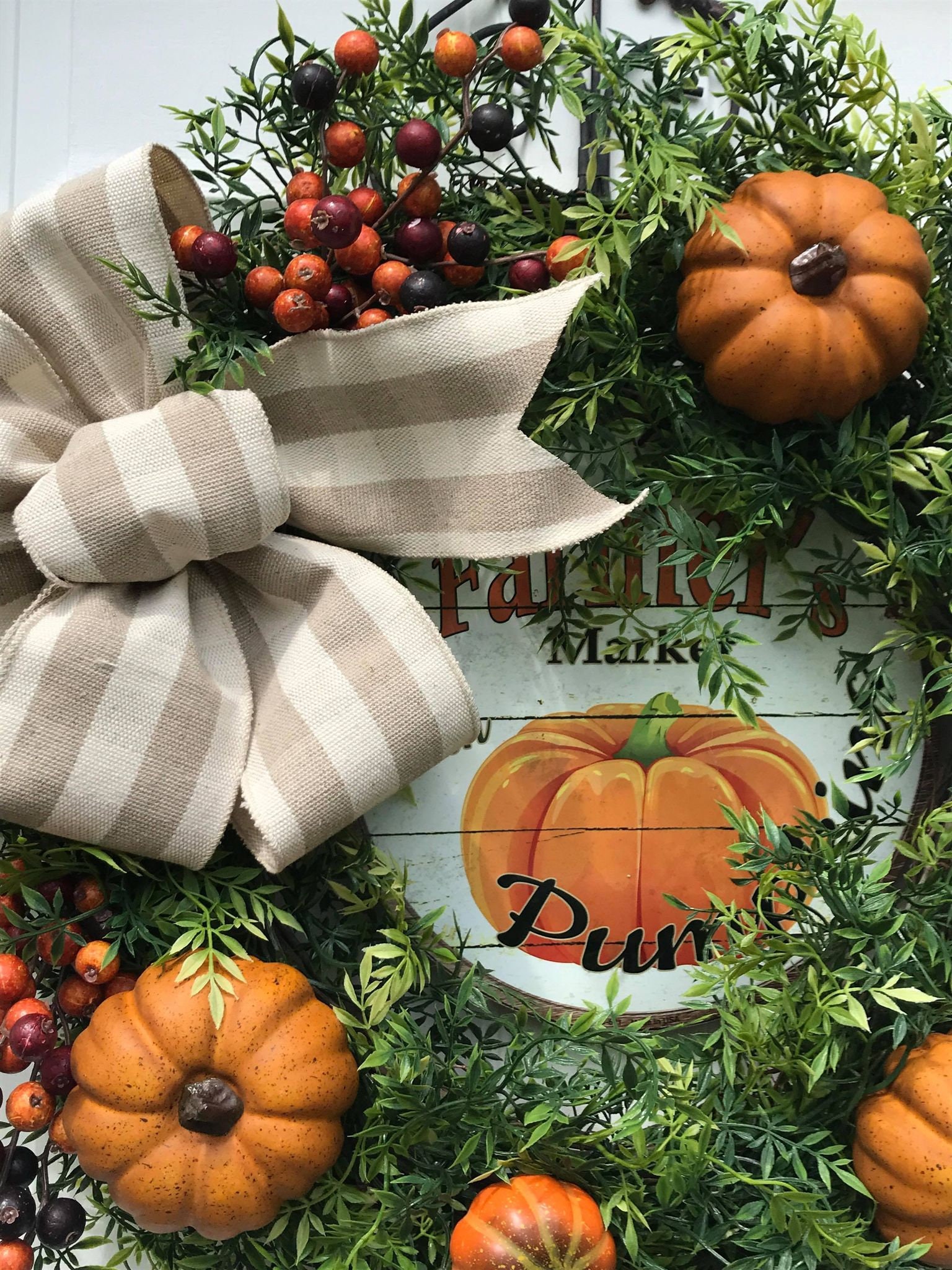 A FRESH TAKE ON A FALL WREATH! FAUX PUMPKINS /BERRIES ADORN THIS REALISTIC GREENERY WREATH . TIN SIGNAGE THAT READS "FARMER'S MARKET FRESH PUMPKINS" & A GORGEOUS BOW COMPLETES