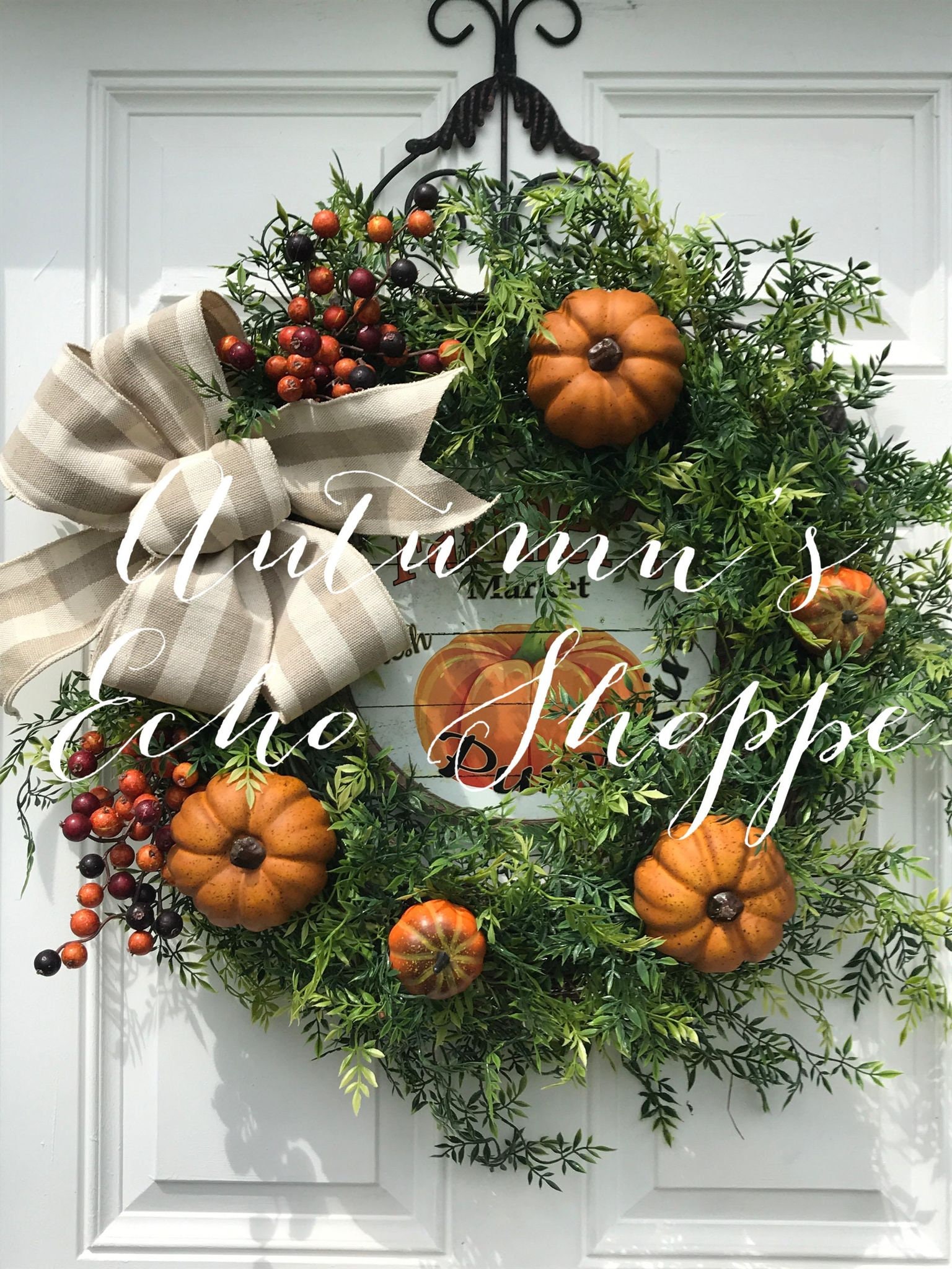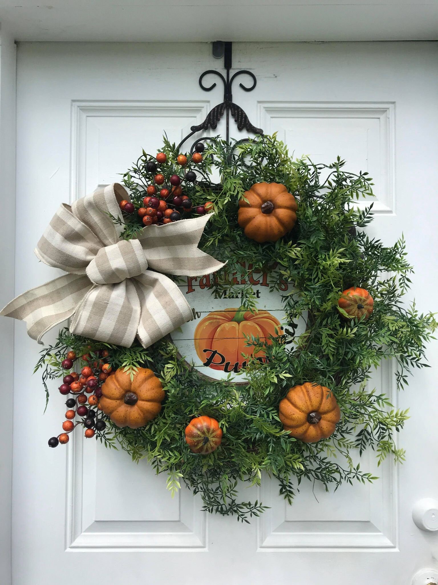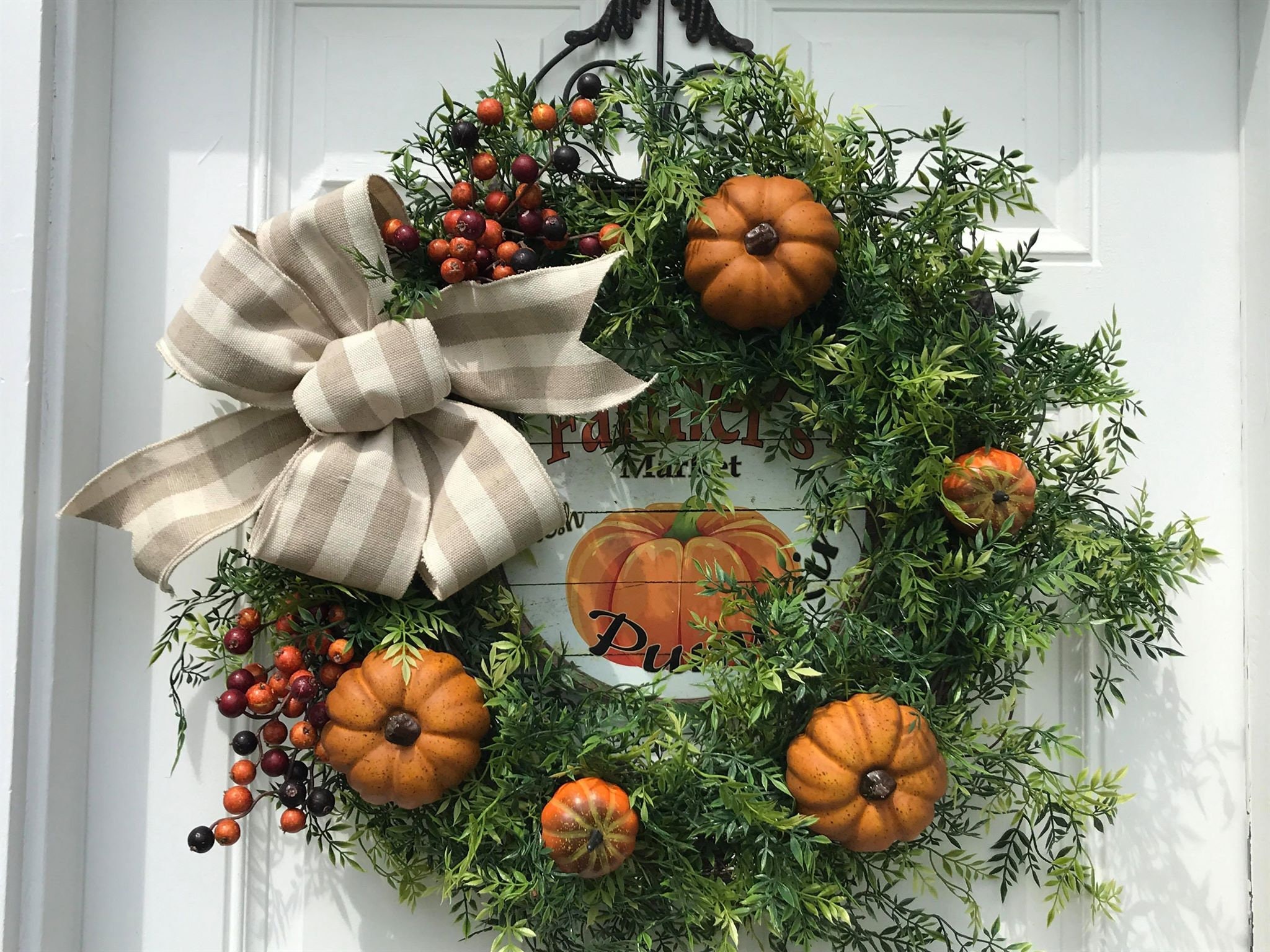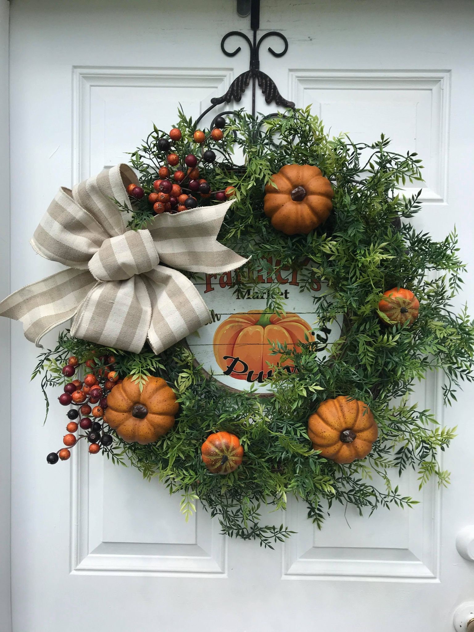 A FRESH TAKE ON A FALL WREATH! FAUX PUMPKINS /BERRIES ADORN THIS REALISTIC GREENERY WREATH . TIN SIGNAGE THAT READS "FARMER'S MARKET FRESH PUMPKINS" & A GORGEOUS BOW COMPLETES