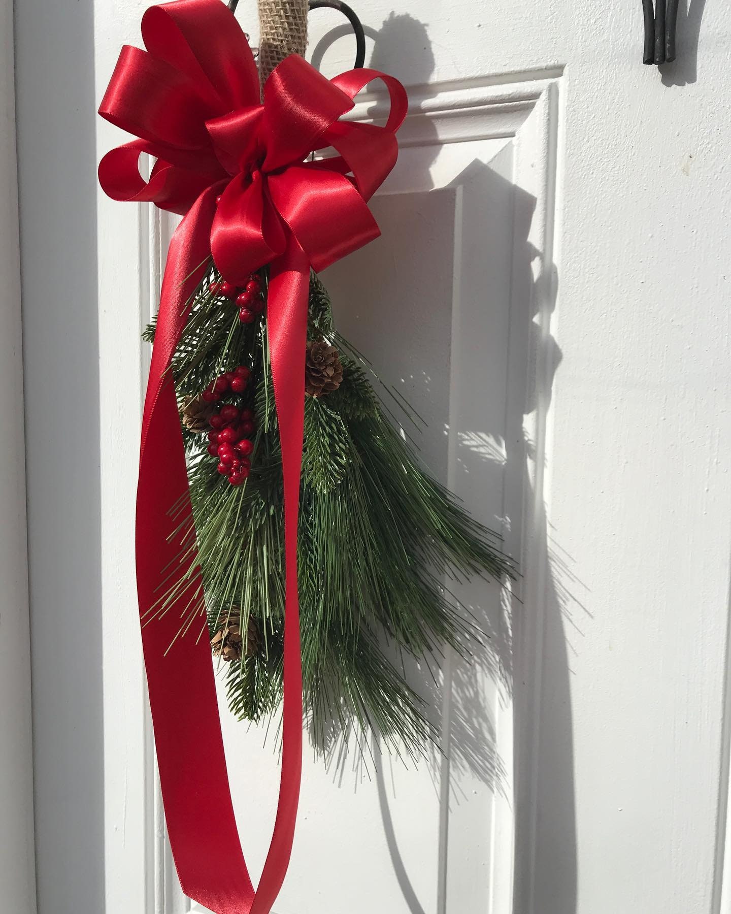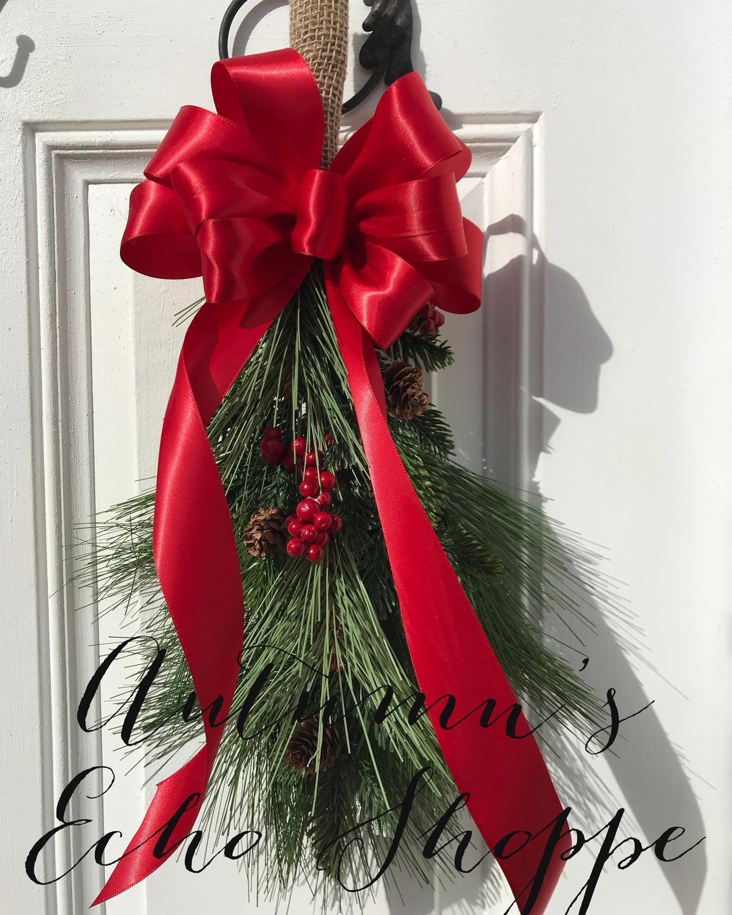 CLASSIC & TIMELESS TRADITIONAL FEEL WITH FAUX PINE GREENERY / PINE CONES/ BERRIES ALL COMPLEMENTED WITH RED SATIN RIBBON ,STREAMERS